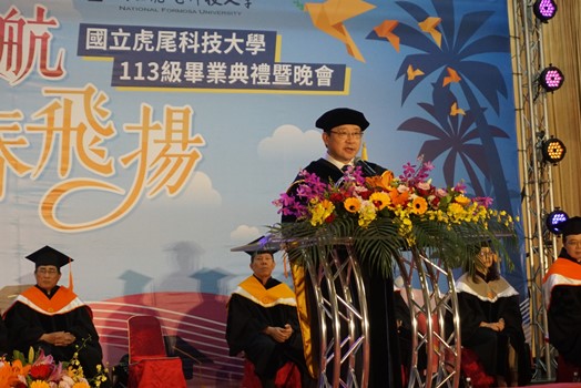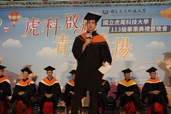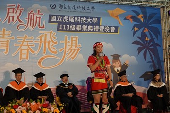 虎科大畢典依學位學程「學、碩、博士」分別邀請三位來自不同民族與國家的畢業生代表致詞。具原住民族血統的飛機工程系的Alufay潘官偲瑋,以阿美族母語表達每位畢業生在大學四年的學習,皆已如種子茁壯結出果實,「Nanay malakapahay a kapah kako」祝福每位同學未來飛高飛遠。