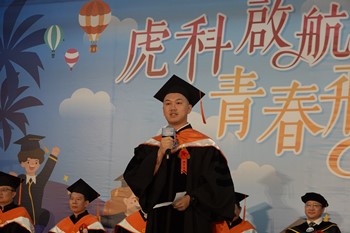 虎科大今年畢業典禮以「虎科啟航 青春飛揚」為主題,透過多國多語的畢業生致詞,展現校園文化兼容並蓄的自由風氣,也祝福莘莘學子在不同人生階段的啟航,都能勇於探索,成就自我。