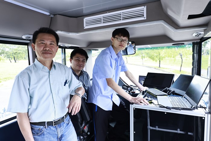 虎科大近期也引進一輛造價 700 萬元的電動巴士,由跨域教師組成團隊,透過產學研合作模式將自駕車次系統技術導入電動巴士。電機工程系教授陳政宏指出,參與計畫的學生一個月至少有一次機會跟企業開會,參與實務實作,對學生來說是難能可貴的經驗!