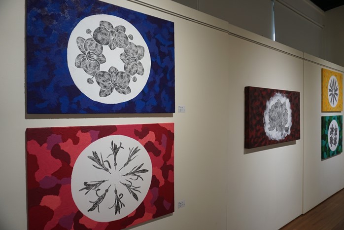 蔡佳吟表示,其在婚後生活不斷嘗試備孕,無論中醫、西醫療程,還是民間信仰的祈禱或各種傳說,過程中交織著好奇、實驗與信任等複雜的心情,廟宇、中藥、花朵及超音波,也都成為畫作中的符號。