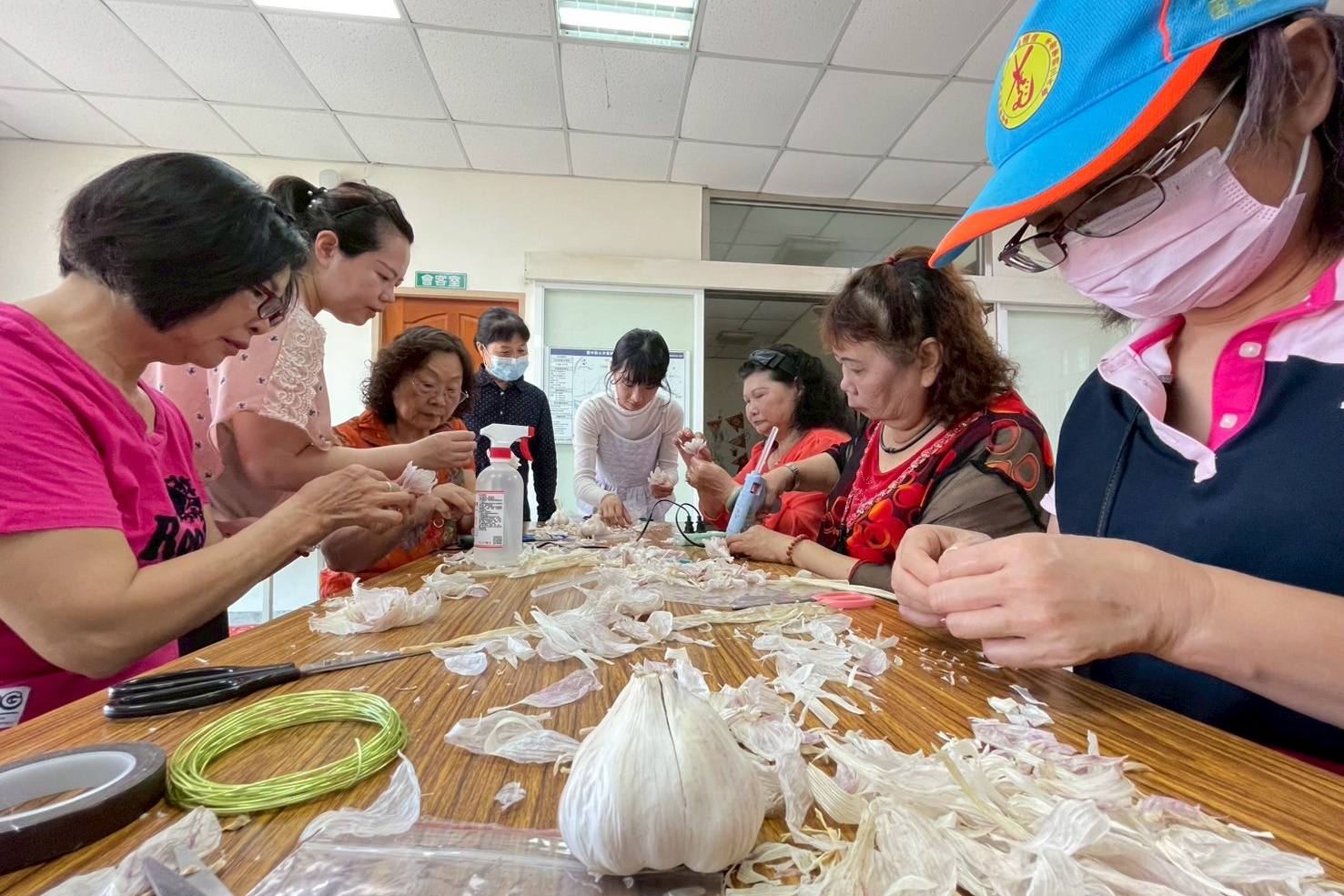 國立虎尾科技大學「水井村智慧減碳節水三生一體社會實踐計畫」團隊4/22(二)於雲林口湖鄉水井社區舉辦「農廢蒜糢新花漾」活動,與在地家政班媽媽及新住民媽媽們攜手推動「不蒜花」母親節花藝活動。活動運用農業廢棄物「蒜糢」(蒜皮)進行手作花藝,融合環保理念與創意巧思賦予廢料新生命,並深化文化共融,促進社區人際網絡的情感連結。