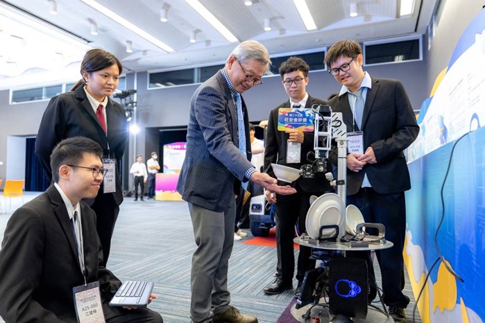 虎科大作品「七軸手臂服務機器人」由資工系教授陳國益指導該系學生簡世憲、張覲顯、江建樺與王俐婷參與研發,針對少子化造成餐飲業缺工問題提出解決方案,設計出能自動清理桌面、收拾碗盤的機器人,不僅提升餐飲服務效率,更兼具智慧化與人性化設計,憑藉創意與成熟技術,獲得應用組銅獎肯定。