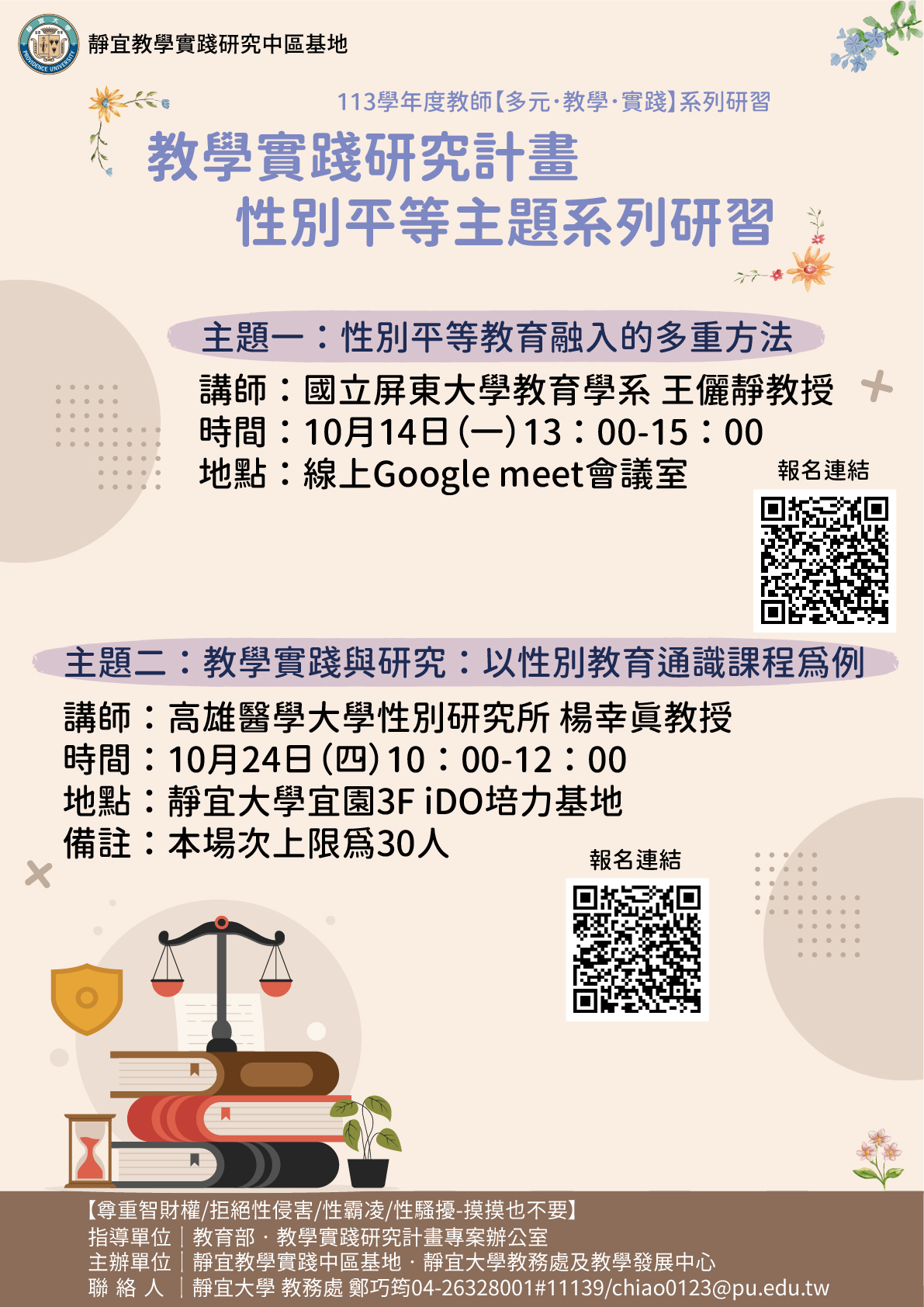 靜宜大學 教學實踐研究計畫中部區域基地謹訂於113年10月14日、 113年10月24月辦理「教學實踐研究計畫性別平等系列研習活動」,敬邀貴校教師踴躍報名參加
