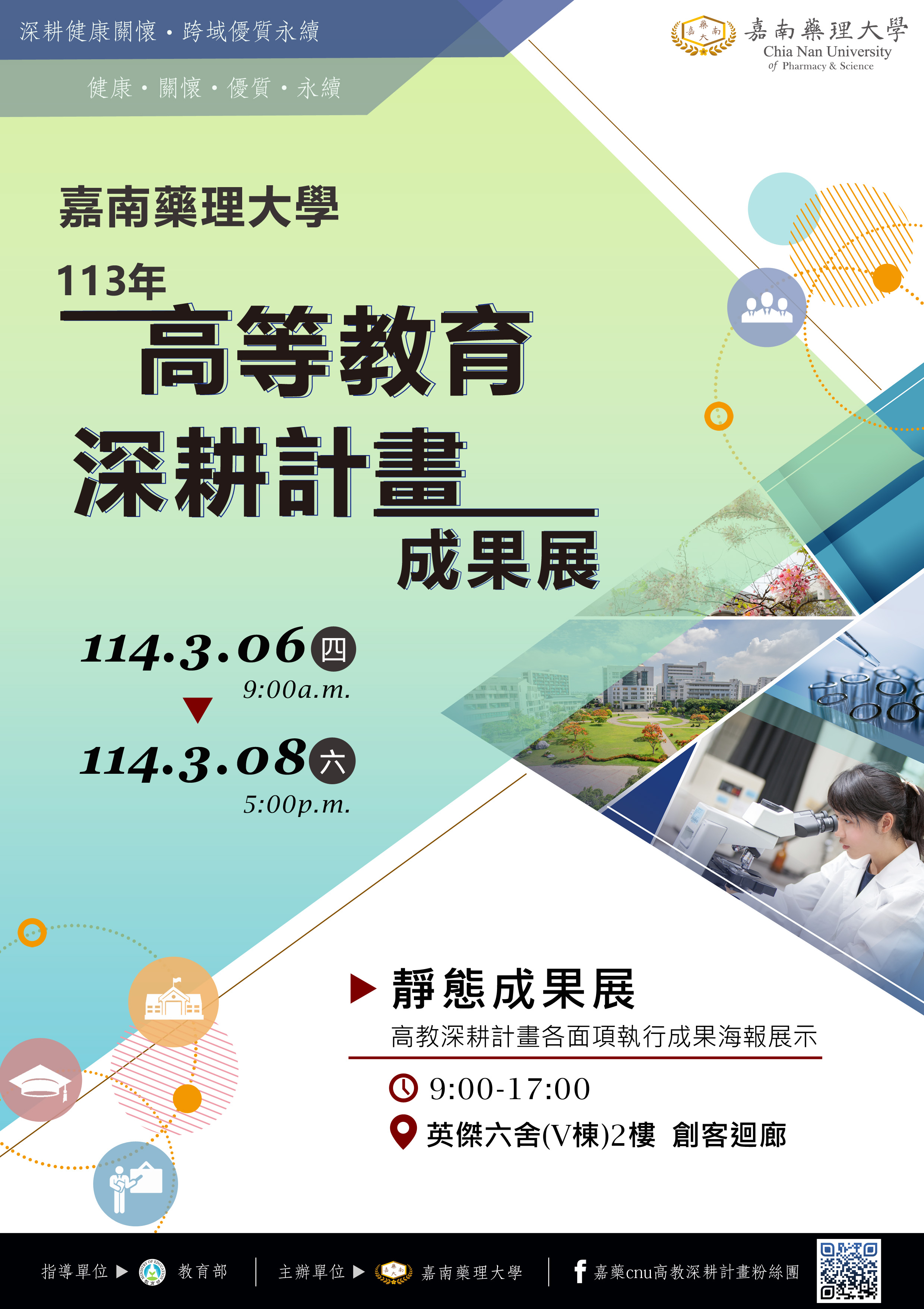 嘉南藥理大學謹訂於114年3月6日(星期四)至3月8日(星期六)辦理「113年高等教育深耕計畫成果展」,敬邀教職員生踴躍參與,共襄盛舉與分享交流