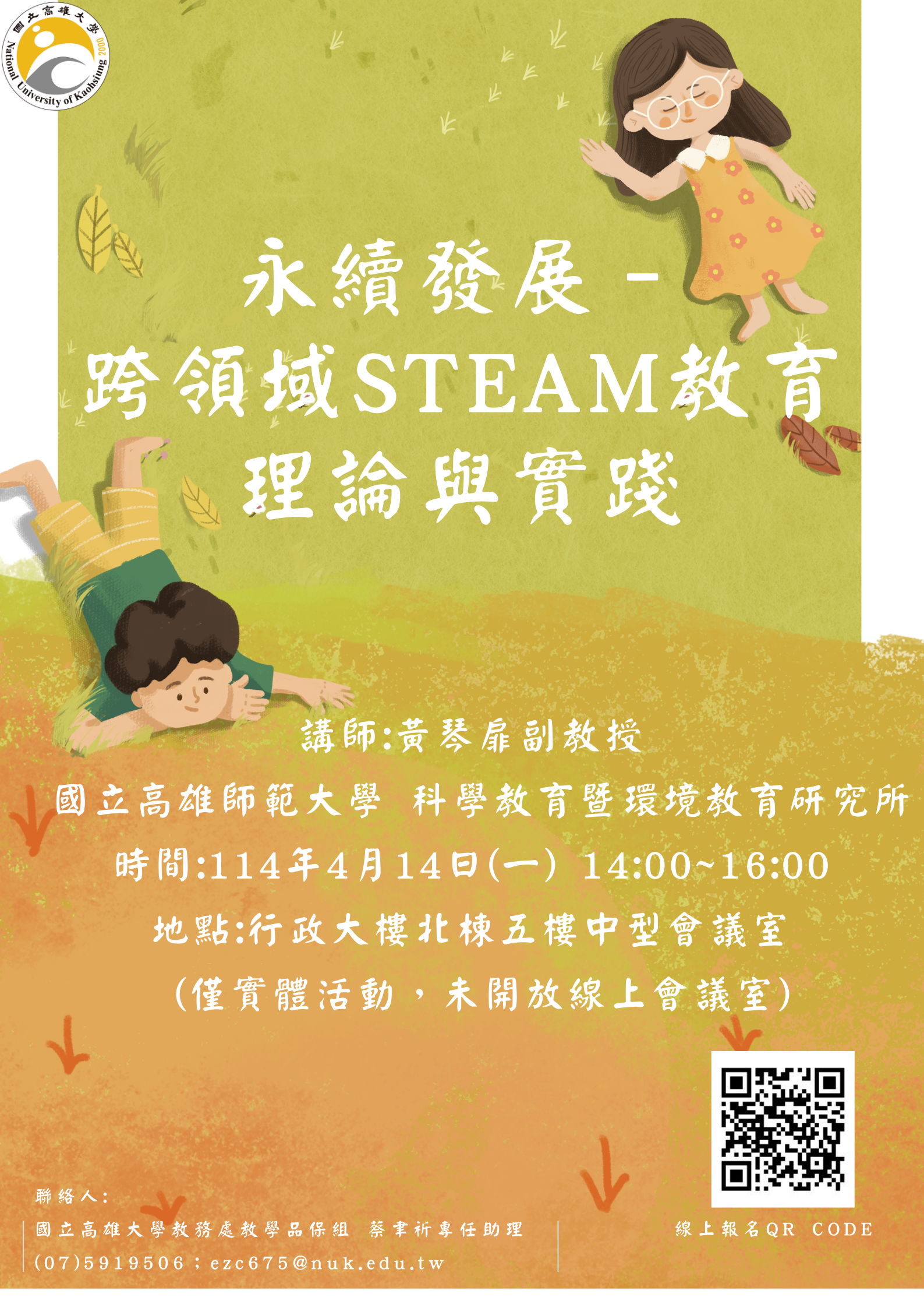 一、為協助教師掌握教學實踐研究計畫撰寫要素,深化教師教學研究能量及教學品質。本校教務處謹訂於114年4月14日辦理《永續發展–跨領域STEAM教育理論與實踐》實體研習活動,邀請國立高雄師範大學科學教育暨環境教育研究所 黃琴扉副教授蒞臨和與會者探討在大學教育場域中,教師如何將課程與STEAM跨域扣合,在課程上該如何實踐跨域、永續發展的精神,讓永續精神能在課程中留下更深的痕跡。