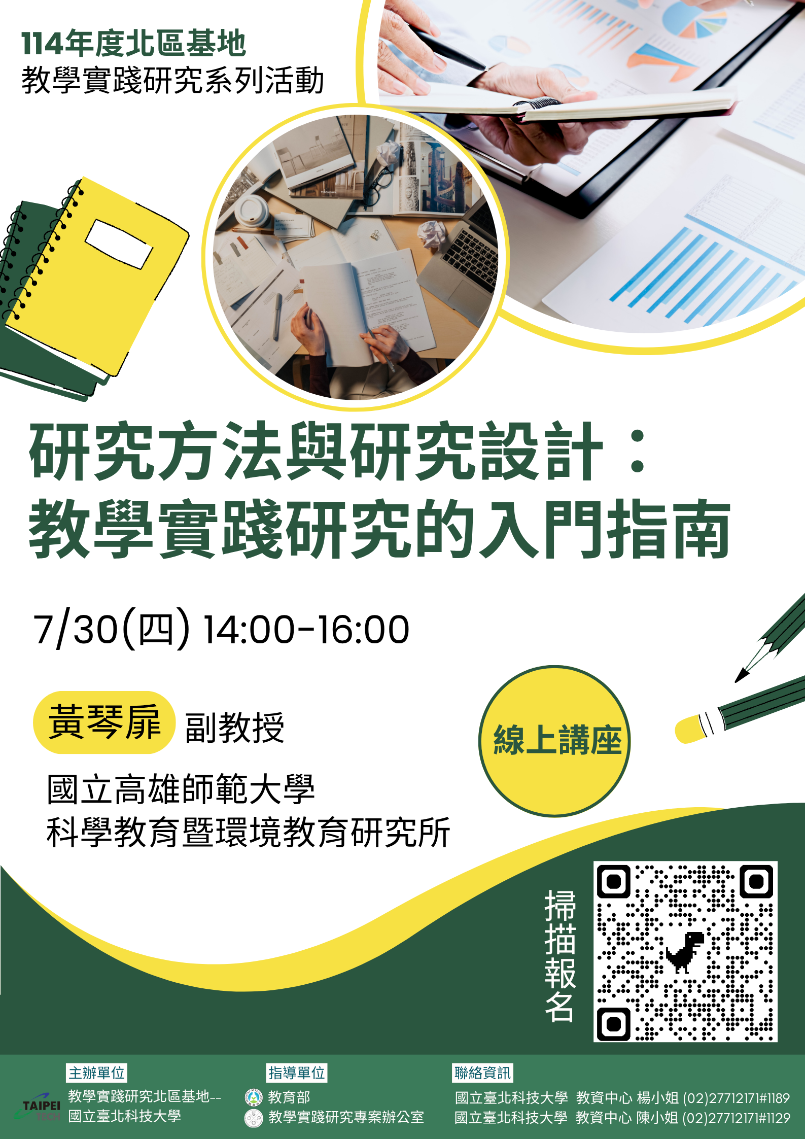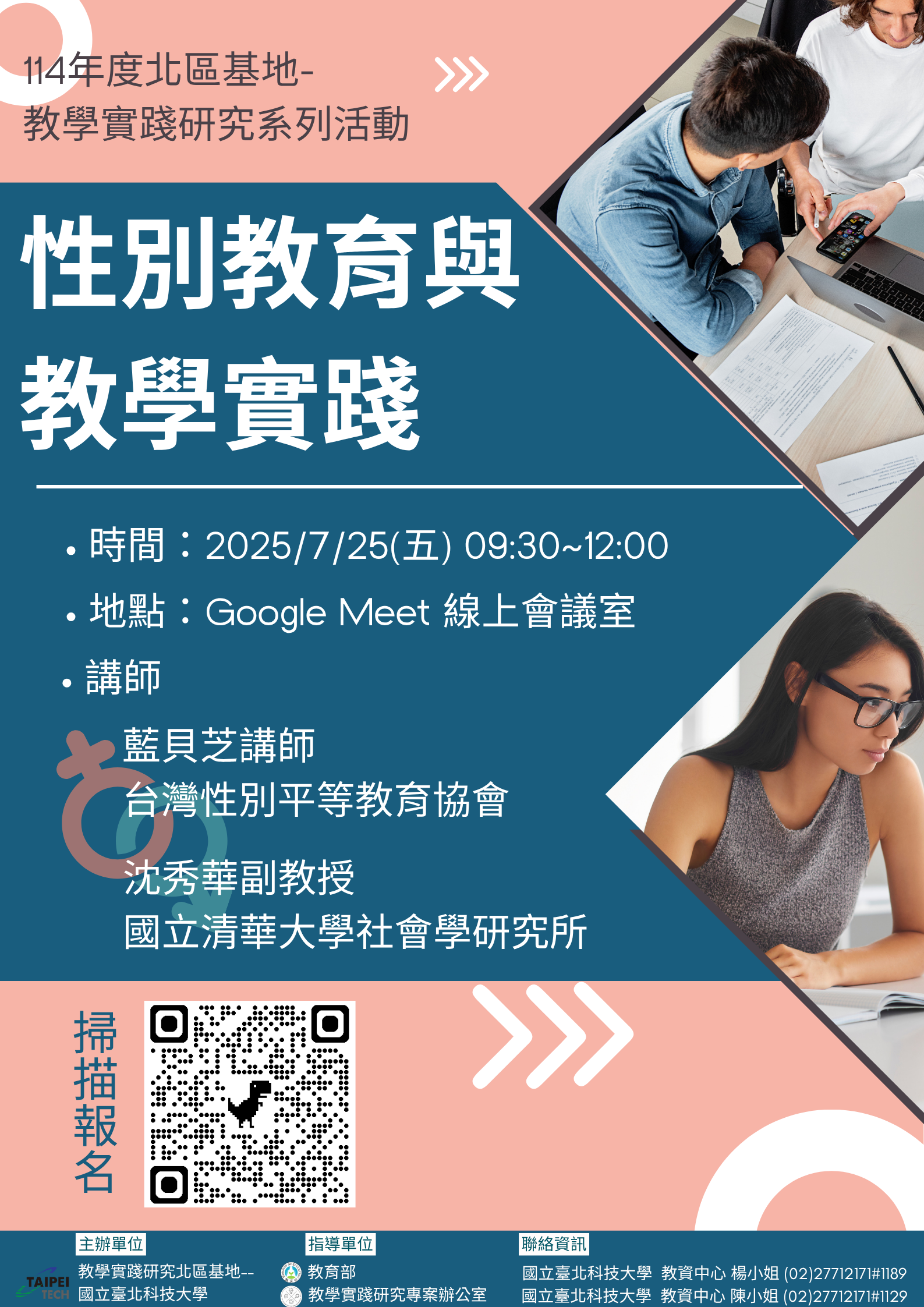 國立臺北科技大學謹訂於114年7月25日(五)辦理性別教育與教學實踐線上工作坊、7月30日(三)辦理研究方法與設計線上工作坊,敬邀教師踴躍報名參加